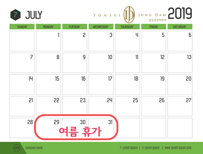 7¿ù Áø·á ÀÏÁ¤ÀÔ´Ï´Ù. ¿©¸§ÈÞ°¡´Â 7¿ù 29ÀÏ ~ 31ÀÏ 3Àϰ£ÀÔ´Ï´Ù.